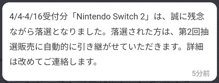 はい、Switch2の公式抽選は無事に落選しましたorz